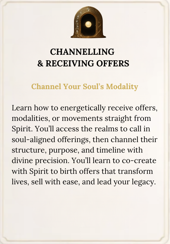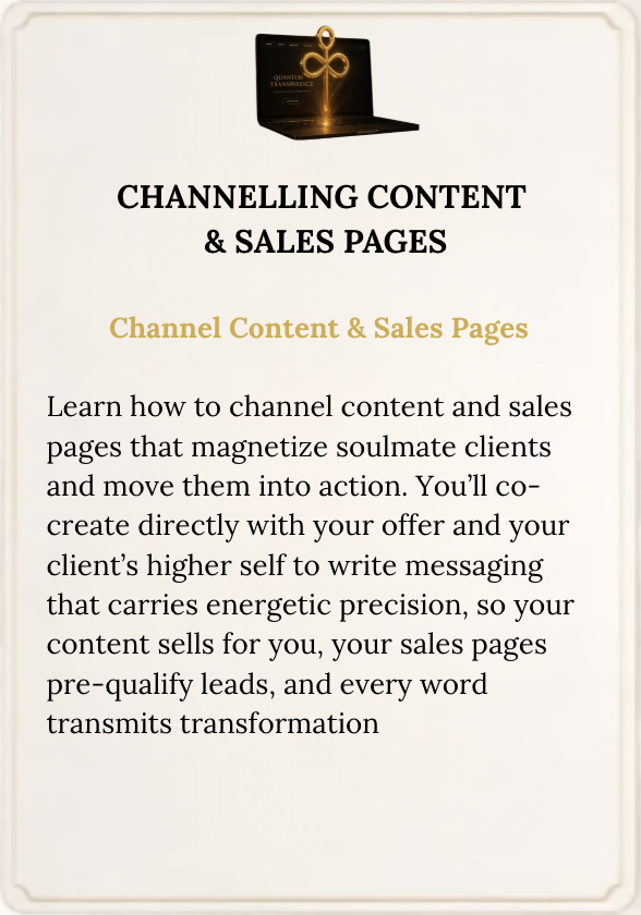 You’ll receive energetic initiations to awaken your divine operating system, your channelling channel. So your intuition becomes razor-sharp, your offerings become medicine, and your messaging becomes a magnetic beacon for your soulmate client.
