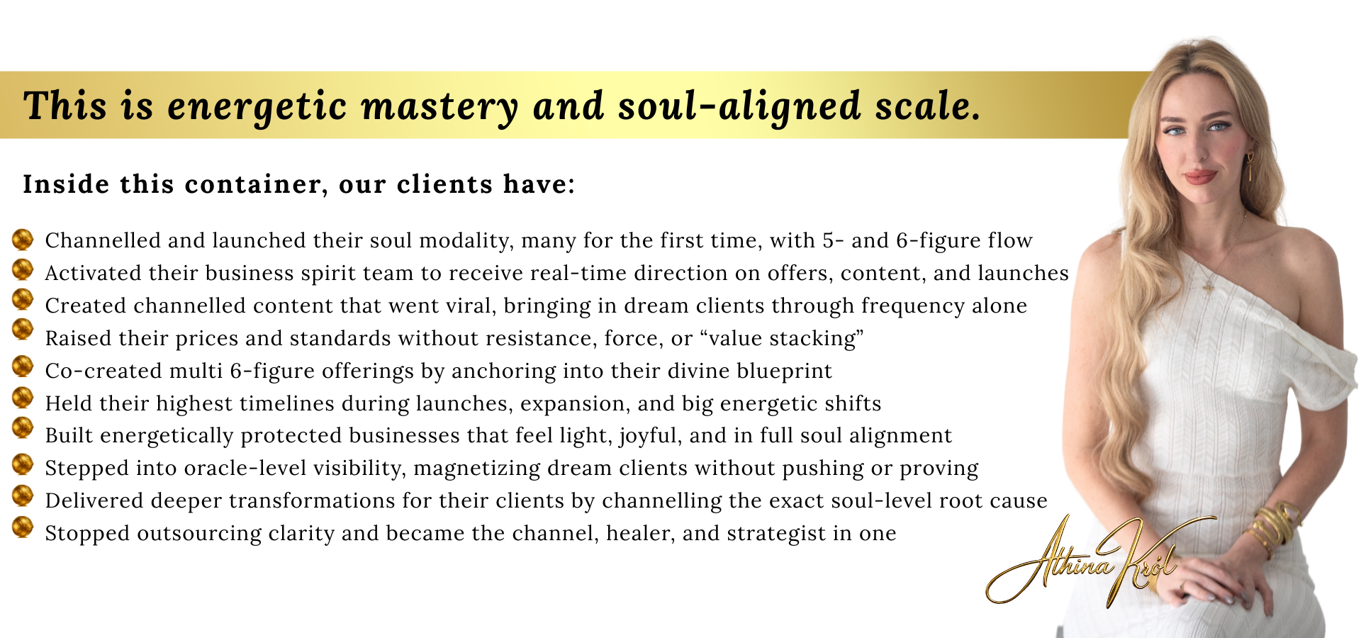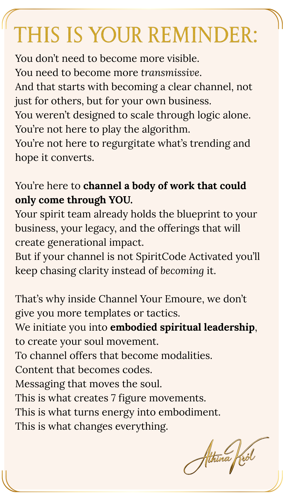 Learn how to channel your offers, sales pages, and programs. Channel your content. Channel your business blueprint. Channel your soulmate clients. These are the exact teachings Athina uses to scale 6–7 figure spiritual businesses with spirit-led precision.