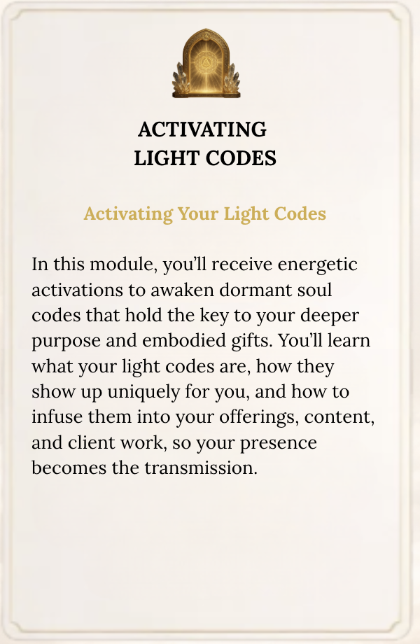 These sessions include activations, teachings, and healings designed to support you as you move through the modules, integrate the work, and expand into your next level.