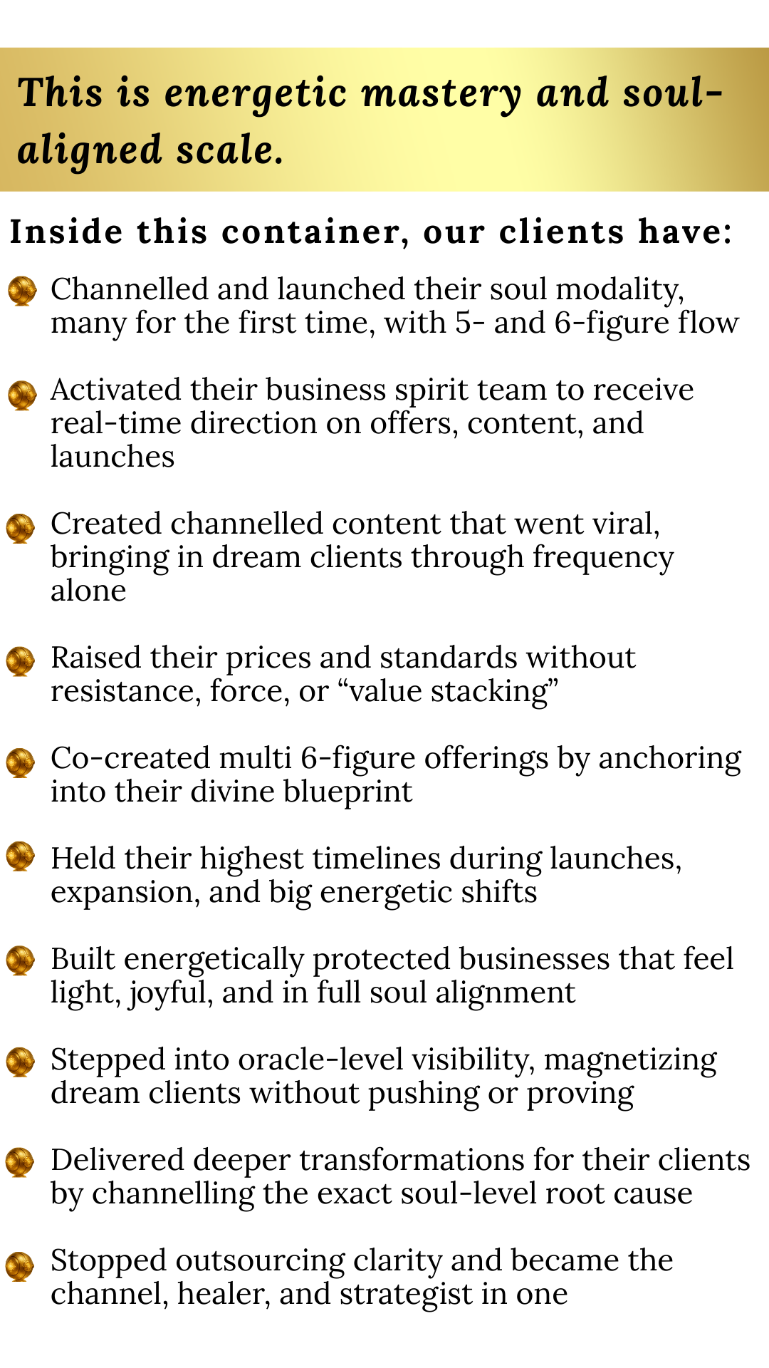 This is a high-level spiritual business program for spirit-led leaders who are ready to lead, scale, and become known for their multidimensional mastery.